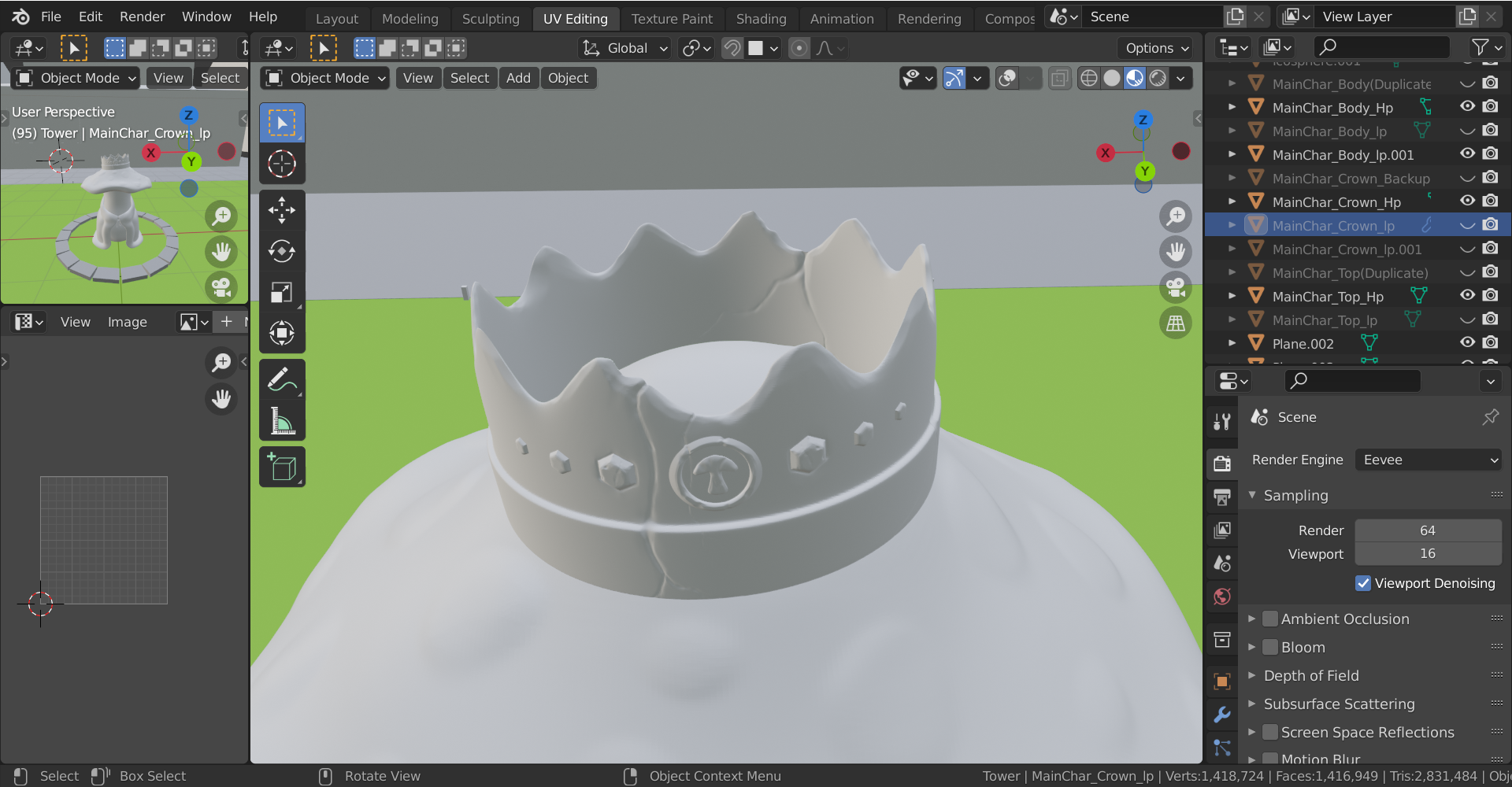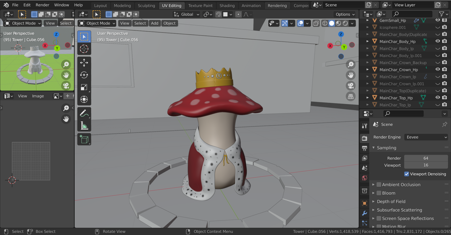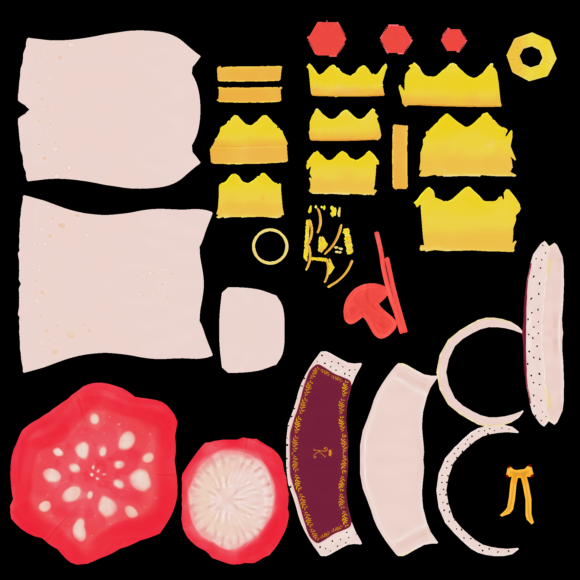 Work was done on the main character including: High to Low poly, using normal maps to bake high poly sculpt data on to lower poly count models. Rougness maps, Metalic maps mainly for the kings crown, and hand painted colour maps were also all used to get the right look to the game that I had in mind.
